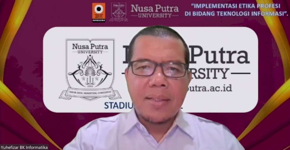 Sabtu, 4 Januari 2025, Universitas Nusa Putra mengundang Dr. Ir. Yuhefizar, S.Kom., M.Kom, IPM., ASEAN Eng, Ketua Badan Kejuruan Informatika Persatuan Insinyur Indonesia (PII), untuk memberikan kuliah umum tentang "Implementasi Etika Profesi di Bidang Teknologi Informasi". Acara ini berlangsung secara online dan dihadiri oleh seluruh mahasiswa Teknik Informatika dari pukul 09.00 hingga 11.00 WIB.