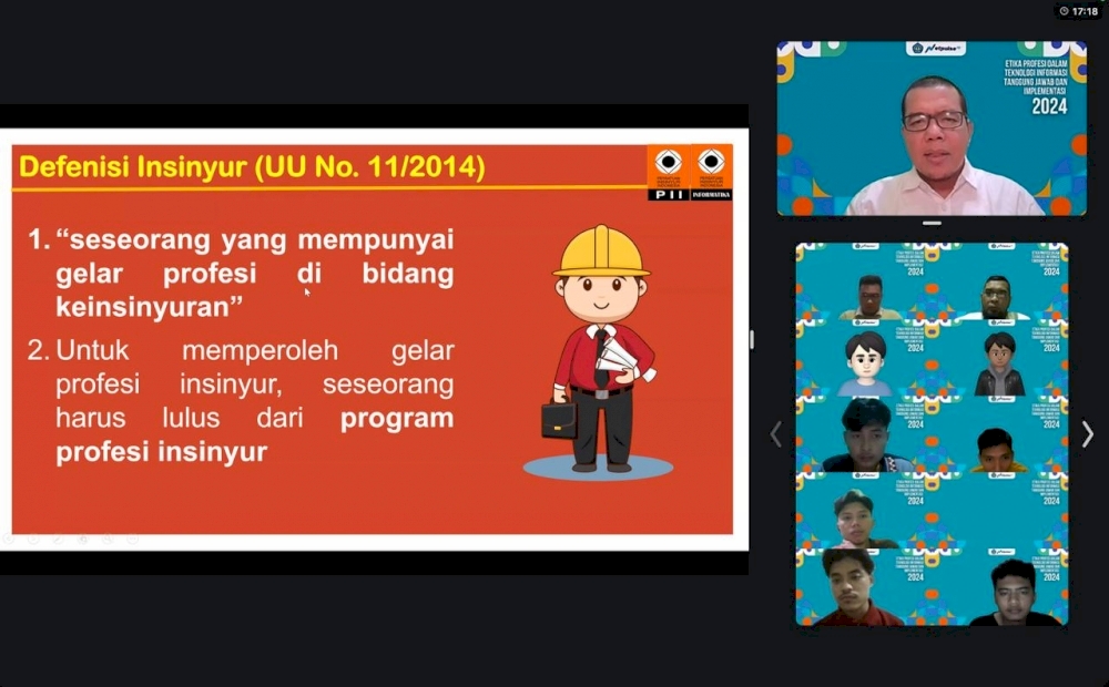 Acara ini merupakan bagian dari Mata Kuliah Etika Profesi Bidang Teknologi Informasi, yang diampu oleh Ir. Imam Asrowardi, S.Kom., M.Kom., M.Pd., IPM., ASEAN Eng., kolega narasumber, Dr. Yuhefizar, S.Kom., M.Kom., IPM., ASEAN Eng., di Badan Kejuruan Informatika (BKI) Persatuan Insinyur Indonesia (PII).